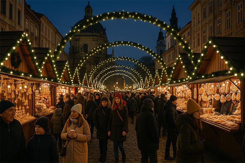 У Львові ярмарки вкладають душу і традиційно відкривають їх на початку грудня. Тривають вони до кінця січня, наповнюючи центр міста атмосферою справжньої казки. Основні ярмаркові точки — площа Ринок, проспект Свободи та прилеглі вулички, де світло гірлянд відбивається в бруківці.