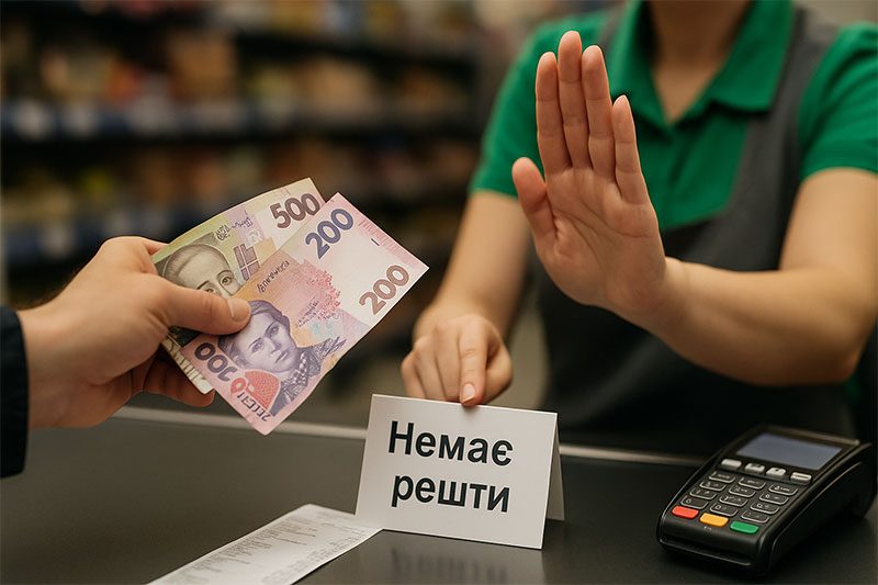 У першому тижні жовтня 2025 року 11 жовтня в київському Silpo на Хрещатику покупець не зміг розрахуватися купюрою 500 грн. Так само 14 жовтня працівники Novus у Львові відмовилися прийняти 200-гривенну банкноту, посилаючись на «відсутність дрібних». Подібні випадки зафіксовано в АТБ, «Сільпо» й “Фора” у семи обласних центрах.